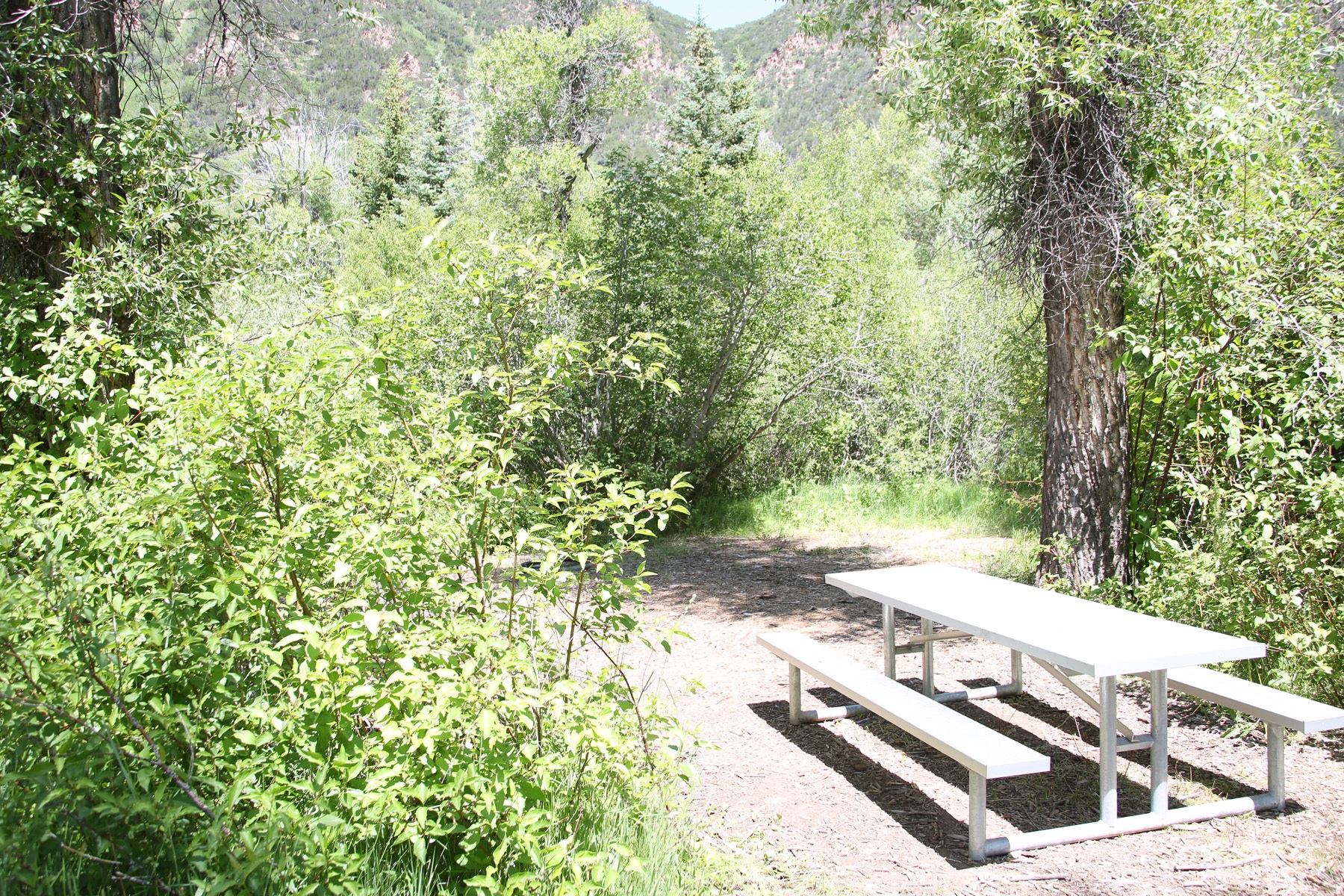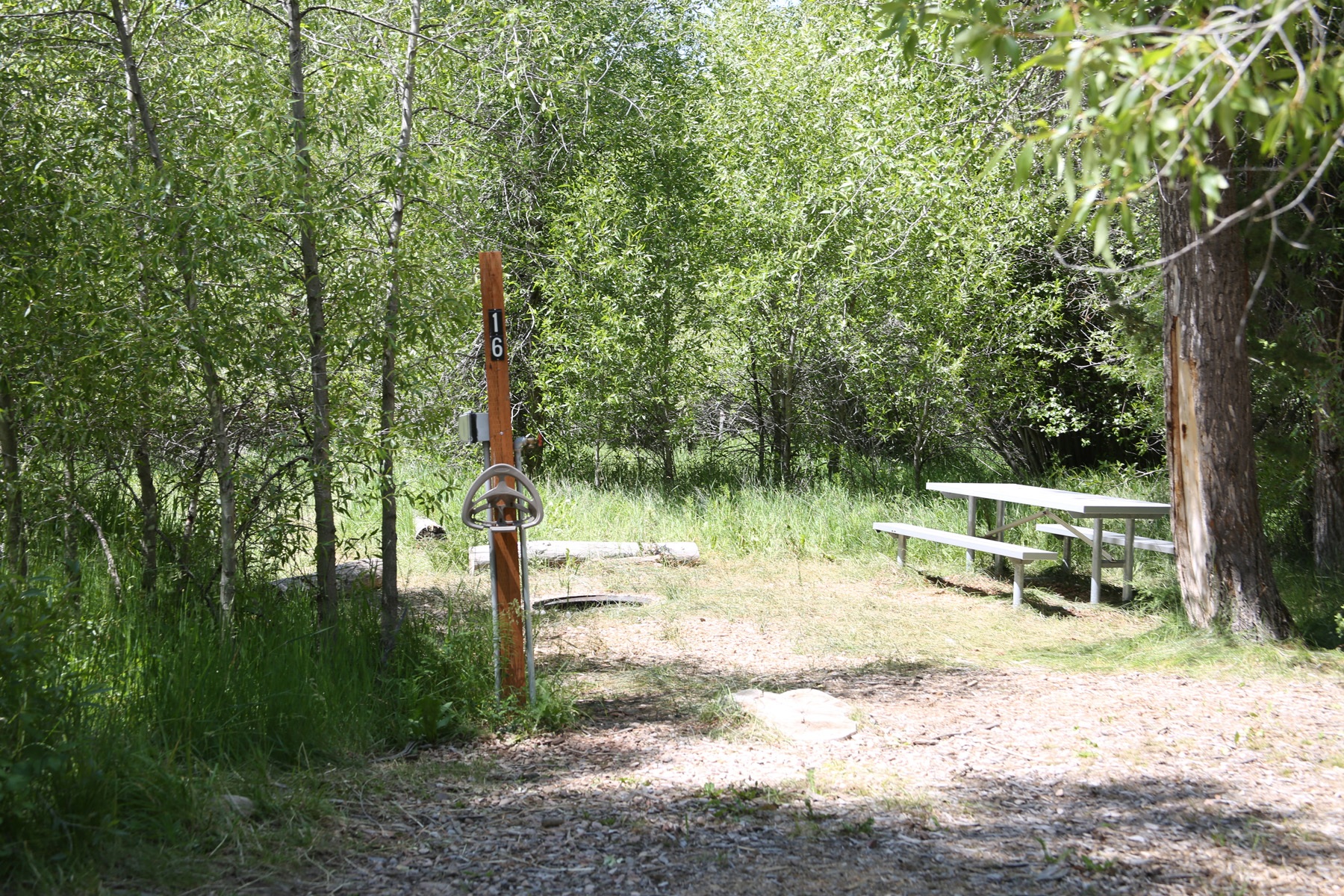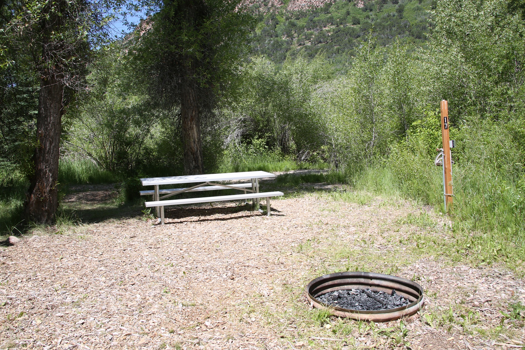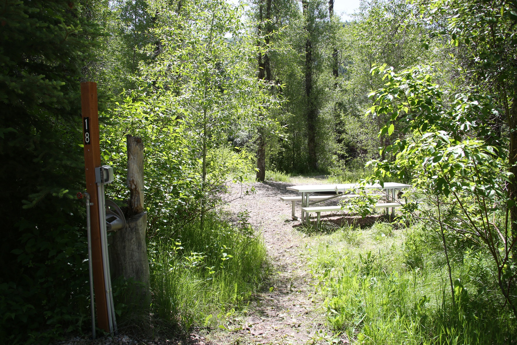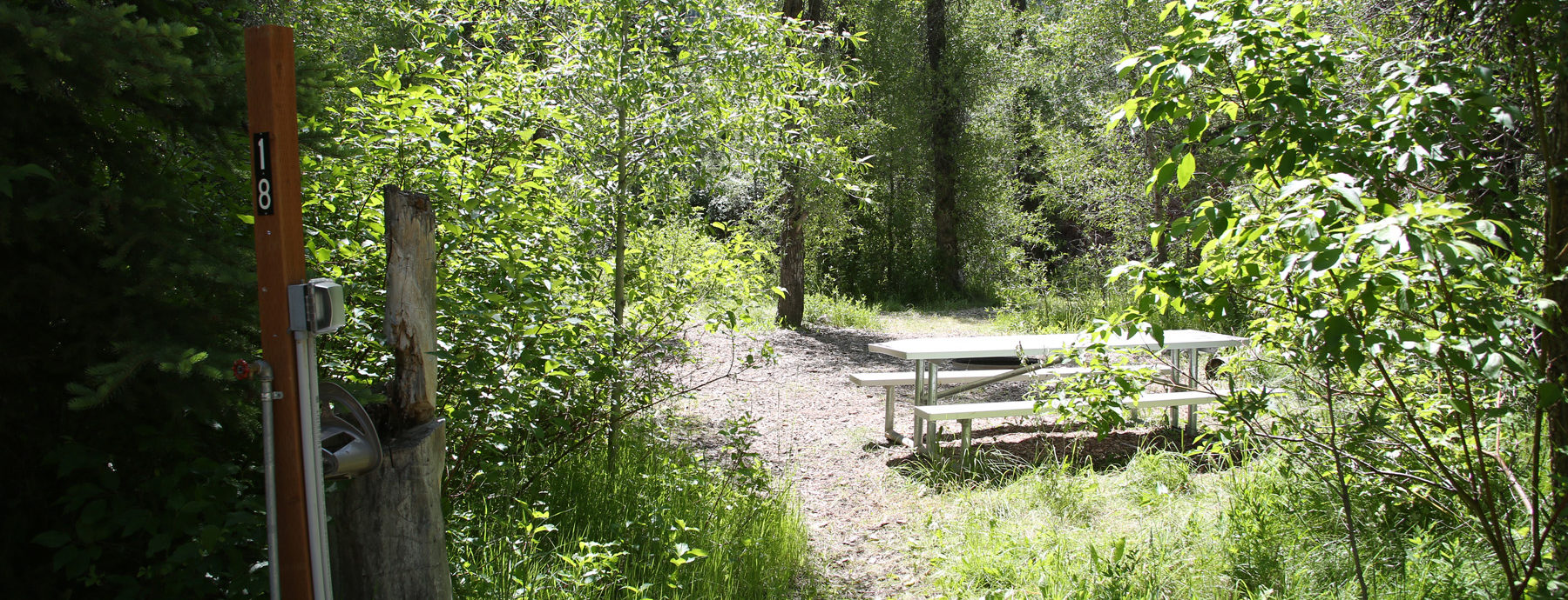 Campsite in the South Fork Area for 12 overnight campers with a fire pit, picnic table, water, power, and access to an ADA shower and toilet facility.