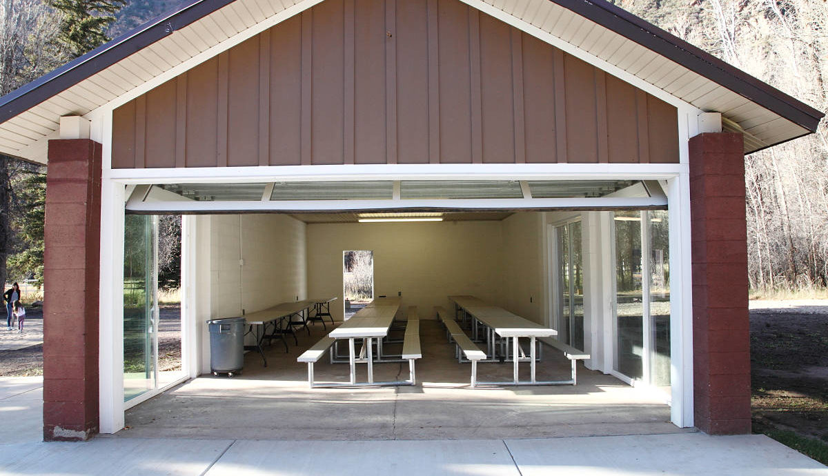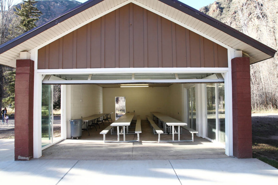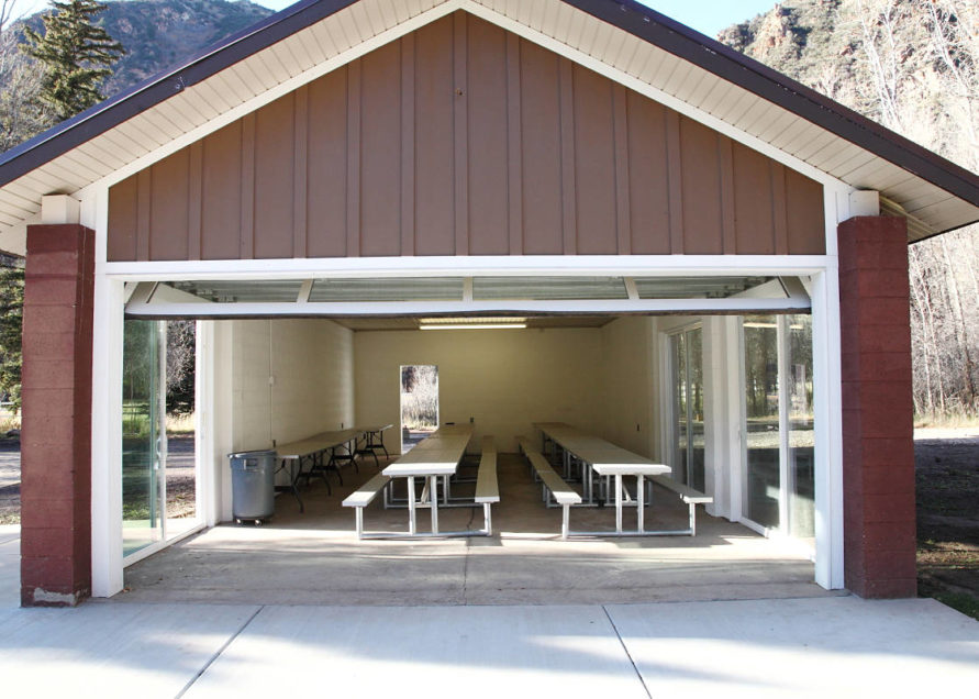 An enclosable pavilion with picnic table seating for up to 70 campers.